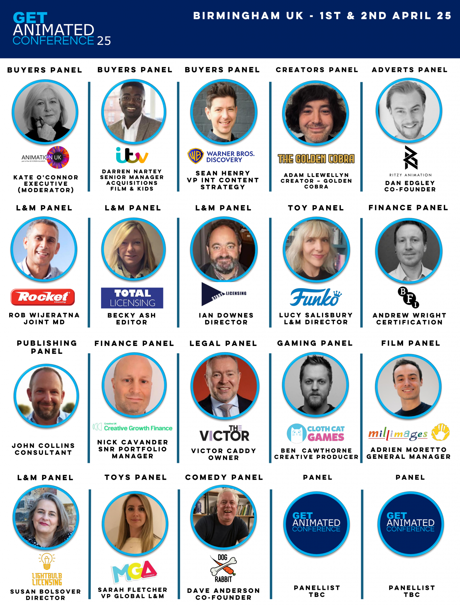 The confirmed speakers so far include ITV, Warner Bros Discovery., Animation UK, The Golden Cobra (BBC3), Ritzy Animation, Rocket Licensing, Total Licensing, Start Licensing, Funko, The BFI, John Collins Consultant, Creative Growth Finance, IAM The Victor, Clothcat Games, Millimages, Lightbulb Licensing, MGA Entertainment, Dog & Rabbit and Paramount.