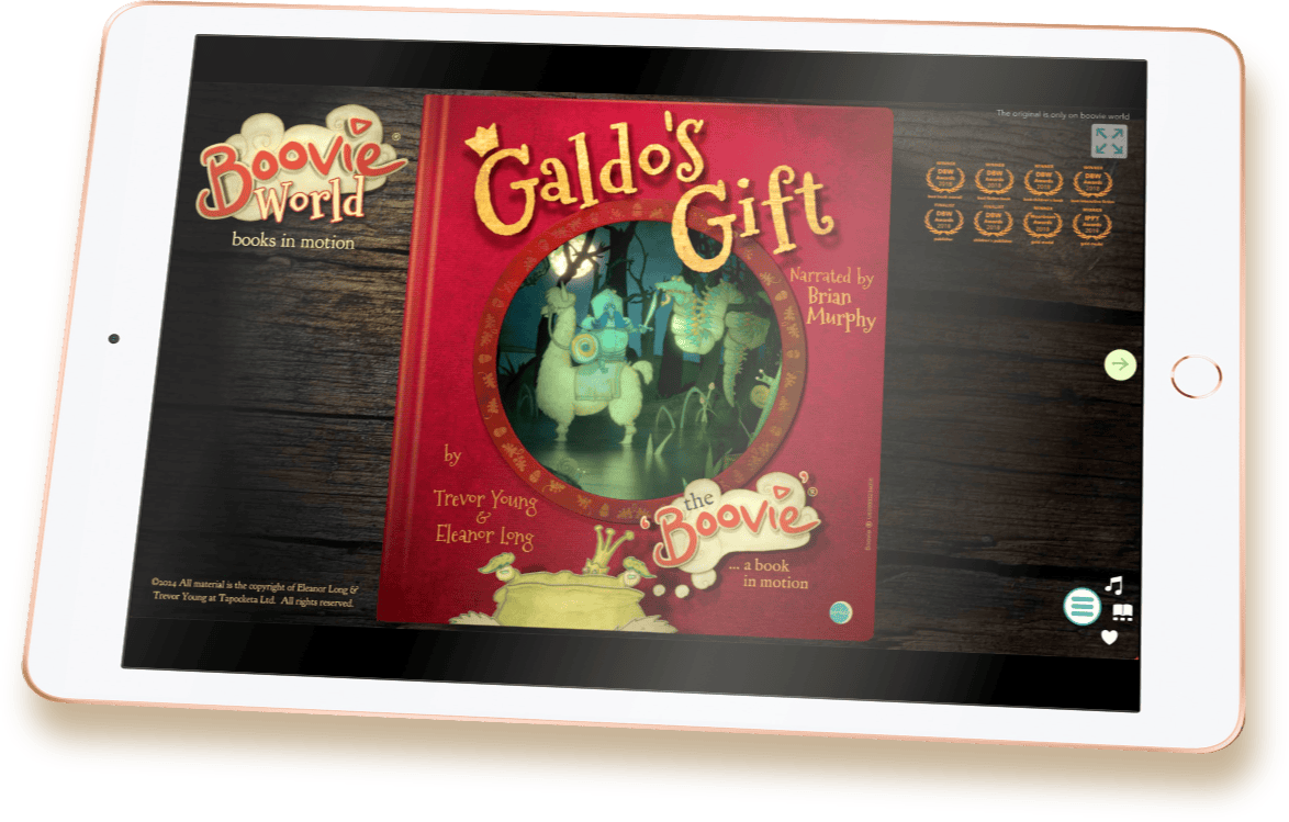 Originally an ebook on the Apple Store (where it reached no. 3 in the kid’s charts among the Harry Potters and won a slew of awards), it has now been completely reconfigured and will be developed to work in web browsers on any device. Galdo’s Gift will be a fully browser-based experience making it truly accessible to everyone, especially as browsers and devices are now sufficiently advanced to be able to support its features. The ambition is to make sure no child is left behind in their journey to a love of literature, so the intention is to make the core Boovie® storybook free with the backing of sponsorship.