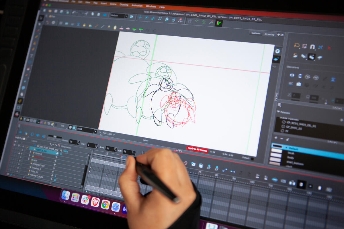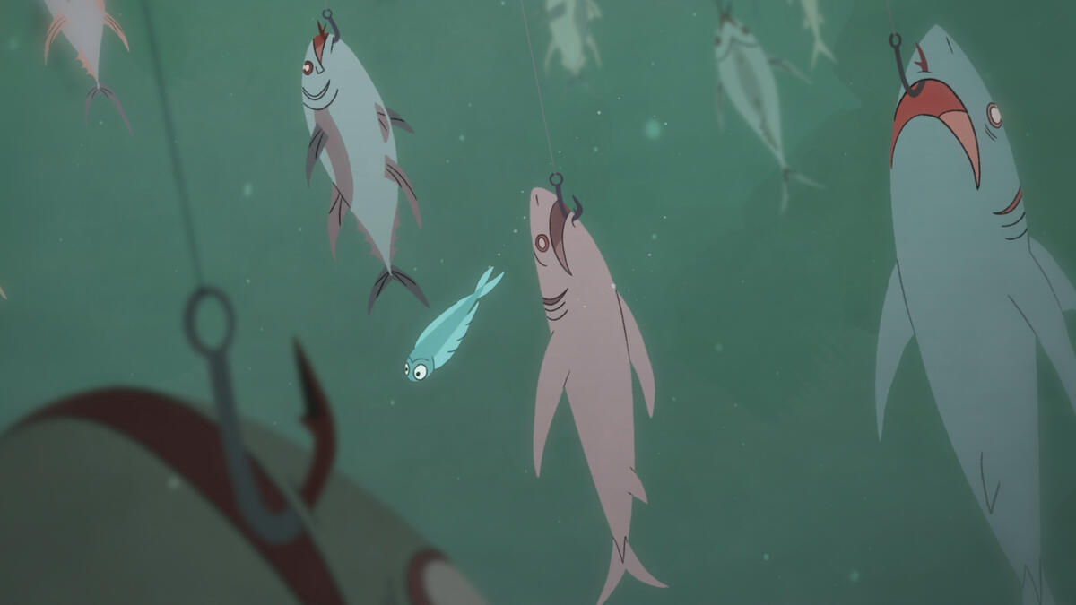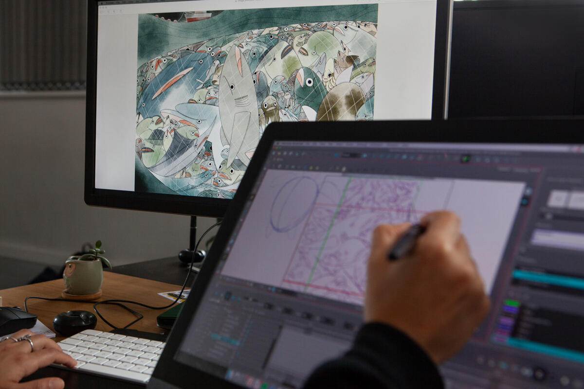 We did lots of development on how the hero characters would move. Animator Marta Dias was the lead on the eel and did an incredible job on the ‘flowiness’ of her body. Animation Director Luke Hyde led on the flying fish and added so many beautiful flourishes to how she twists and turns in the water.