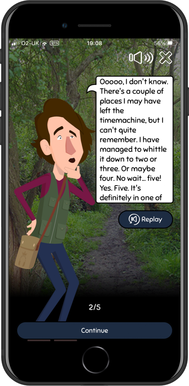 As with all Useeum games the phone is the tool not the focus. The user must find and answer questions about real exhibits in the museum, with correct answers bringing Ali closer to remembering where he parked that blasted time machine.